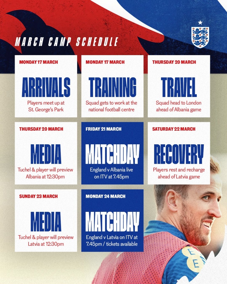 3月17日訊 英格蘭隊官方公布了今年首次集訓的日程,三獅軍團將在世預賽小組賽中對陣阿爾巴尼亞和拉脫維亞。英格蘭隊本次集訓日程:3月17日——集合3月17日——開始訓練3月20日——前往倫敦3月20日——媒體日(12:30圖赫爾和球員參加賽前發(fā)布會)3月21日——主場對陣阿爾巴尼亞(世預賽小組賽)3月22日——恢復3月23日——媒體日(12:30圖赫爾和球員參加賽前發(fā)布會)3月24日——主場對陣拉脫維亞(世預賽小組賽) 本文標簽: 足球 英格蘭