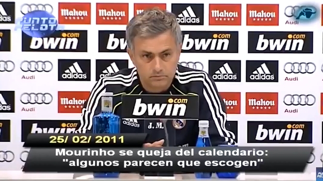 三輪之后,穆里尼奧控訴“他們想毀了聯(lián)賽”。皇馬對陣大力神,巴薩仍保持7分領(lǐng)先優(yōu)勢,而穆里尼奧認(rèn)為賽程安排偏向巴薩。那一輪的導(dǎo)火索是,巴薩周二踢完對阿森納的歐冠比賽后,周日對陣塞維利亞。而下一周,皇馬周三對陣?yán)锇汉?,周六就要在卡爾德隆球場迎?zhàn)馬德里競技的德比戰(zhàn)。