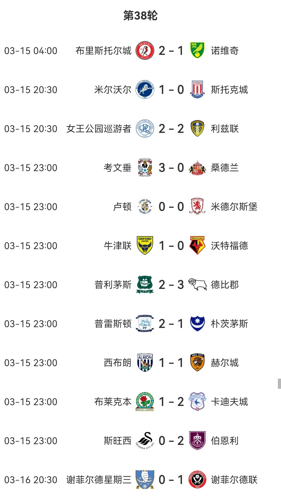 03月17日訊 周末英冠結(jié)束第38輪的較量,榜首的利茲聯(lián)戰(zhàn)平女王公園巡游者,被身后的謝菲聯(lián)積分追平,第3的伯恩利本輪也取得勝利,僅落后前兩名2分。