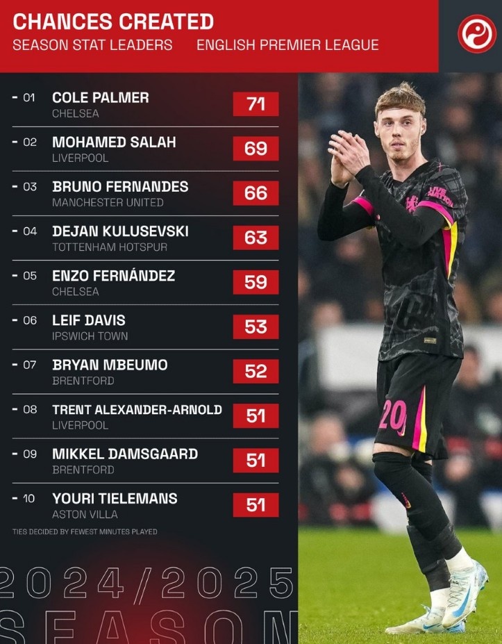 3月17日訊 數(shù)據(jù)網(wǎng)站Squawka盤(pán)點(diǎn)了本賽季英超創(chuàng)造機(jī)會(huì)榜,其中帕爾默以71次居首,不過(guò)他自去年12月對(duì)陣維拉之后還沒(méi)有送出過(guò)助攻。具體創(chuàng)造機(jī)會(huì)榜如下: