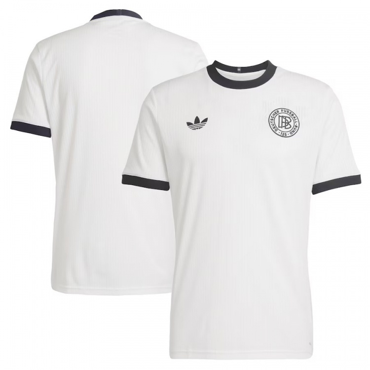 紀念球衣的設(shè)計以1974年復(fù)古球衣為藍本——這一年,德國男足國家隊在本土贏得了世界杯冠軍。125周年紀念球衣的配色和剪裁均承載著德國足協(xié)的歷史:球員版球衣采用經(jīng)典的黑白配色,而守門員球衣則為淡藍色。球衣采用細條紋面料,搭配袖口、圓領(lǐng)衣領(lǐng)以及衣領(lǐng)后方的旗幟印花。球衣胸前繡有阿迪達斯的三葉草標志,以及特別為德國足協(xié)成立125周年設(shè)計的刺繡徽章,而該徽章的涉及靈感來自德國足協(xié)在萊比錫成立地所懸掛的紀念牌匾。
