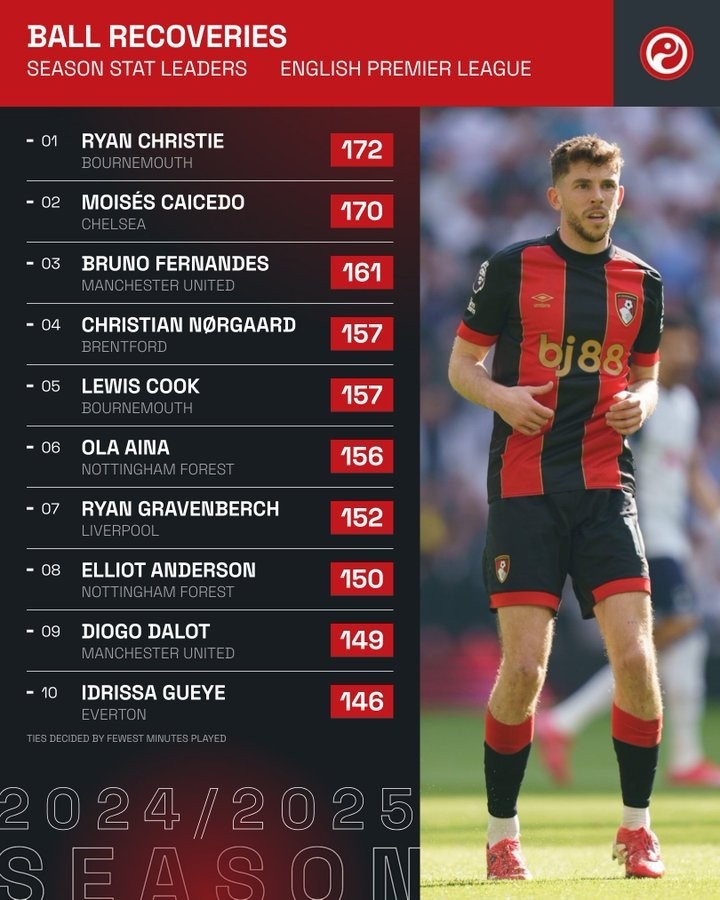 3月18日訊 國家隊比賽周到來,英超也暫時告一段落,squakwa統(tǒng)計了本賽季英超贏得球權(quán)情況,克里斯蒂居首。