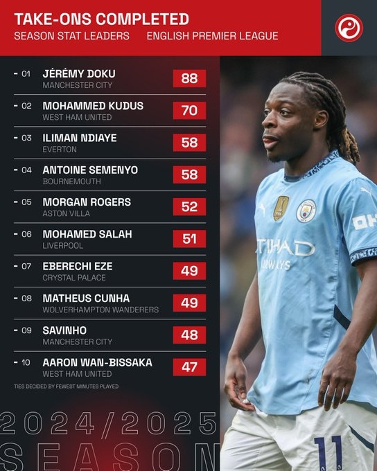 3月18日訊 曼城在本輪英超2-2戰(zhàn)平布萊頓,多庫單場13次成功過人。squakwa也統(tǒng)計(jì)了本賽季英超成功過人榜,多庫獨(dú)自領(lǐng)跑。