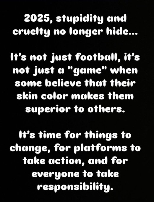 韋斯利-福法納寫道:“2025年,人們已經(jīng)毫不掩飾自己的愚蠢和殘忍。當有人認為他們僅憑膚色就比別人更優(yōu)越時,這不僅僅是足球的問題,這不僅僅是一個比賽的問題?!?/p>