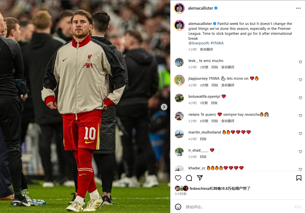 3月18日訊 在聯(lián)賽杯決賽中,麥卡利斯特首發(fā)出戰(zhàn),最終利物浦1-2不敵紐卡,無緣冠軍。麥卡利斯特在社交媒體上寫道:“對我們來說,這是痛苦的一周,但這不會改變我們本賽季的出色表現(xiàn),特別是在英超聯(lián)賽中。是時候團(tuán)結(jié)一致,在國際比賽日之后全力以赴了?!?/p> 本文標(biāo)簽: 足球 英超 利物浦