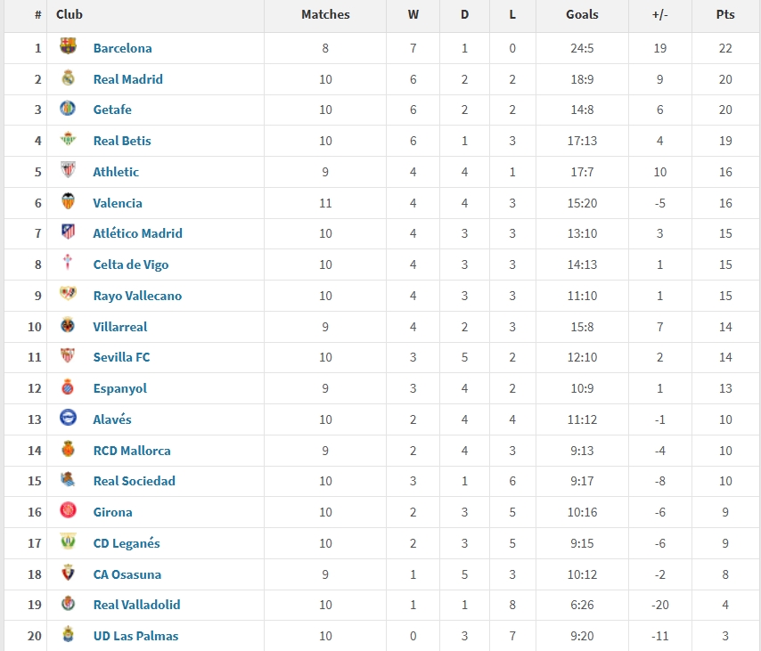 皇馬6勝2平2負(fù)積20分第二。馬競(jìng)僅取得4勝3平3負(fù)積15分,位居第7。