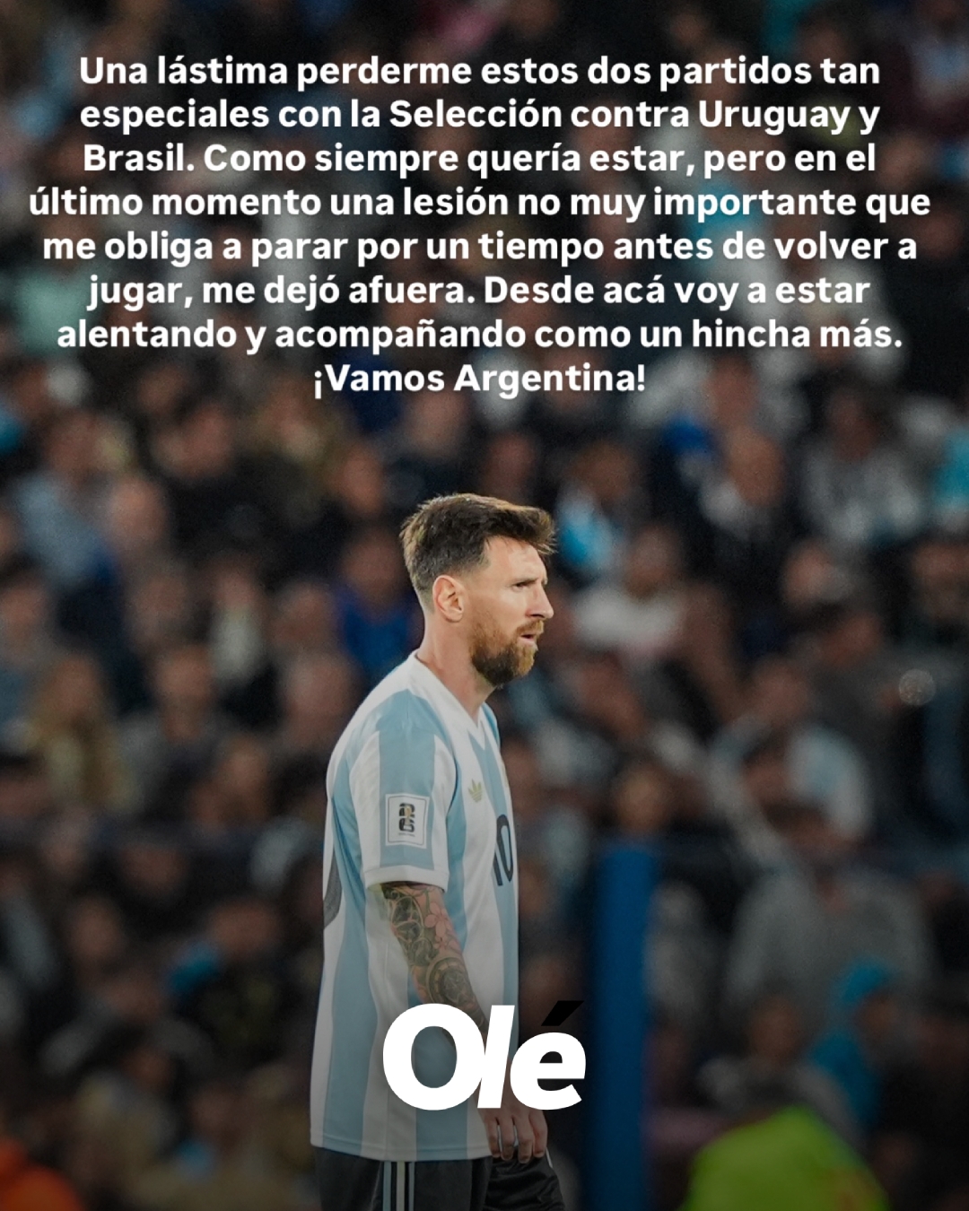 隨后,梅西在社媒上發(fā)文表示:“非常遺憾我將錯(cuò)過與烏拉圭和巴西的兩場(chǎng)比賽。盡管我始終渴望參賽,但最后一刻出現(xiàn)的輕微傷勢(shì)迫使我必須休養(yǎng)一段時(shí)間才能重返賽場(chǎng),這讓我無法參與此次賽事。在此我將作為一名普通球迷繼續(xù)為球隊(duì)加油助威。阿根廷加油!”