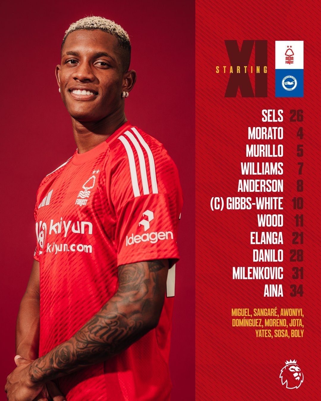 諾丁漢森林替補:33-米格爾、6-桑加雷、9-阿沃尼伊、16-多明戈斯、19-莫雷諾、20若塔-席爾瓦、22-耶茨、24-索薩、30博利