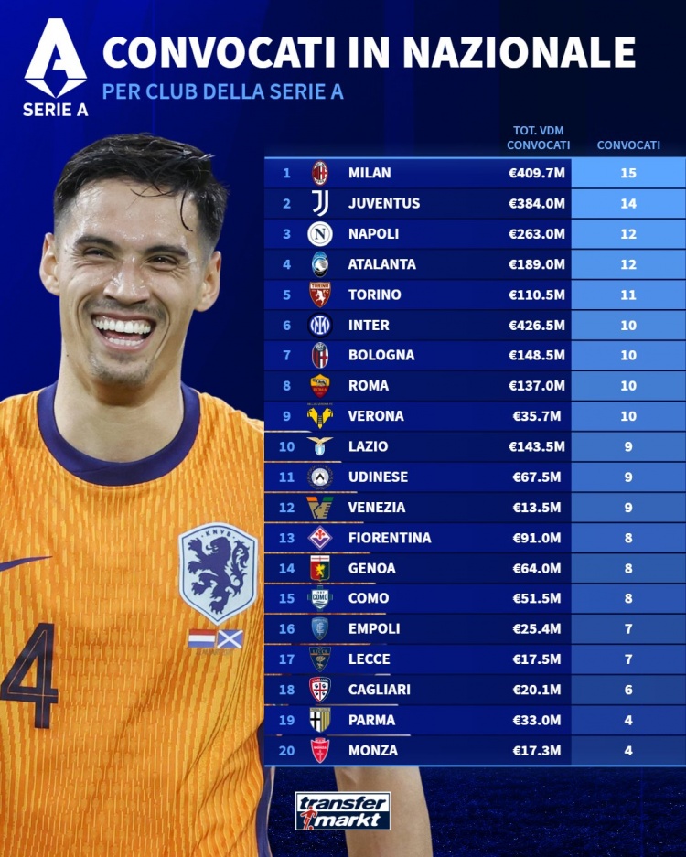 3月18日訊 德國轉(zhuǎn)會(huì)市場統(tǒng)計(jì)了意甲俱樂部被國家隊(duì)征召的球員人數(shù),并列出榜單,米蘭15人最多,尤文14人次席。
