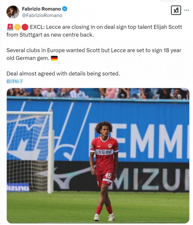 羅馬諾指出,多家歐洲俱樂(lè)部有意斯圖加特中衛(wèi)斯科特,但萊切接近簽下這位18歲的小將。這筆交易基本達(dá)成協(xié)議,各方正在敲定細(xì)節(jié)問(wèn)題。