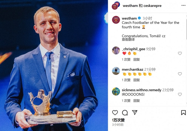 西漢姆官方賬號也轉(zhuǎn)發(fā)了該消息,并配文:“第4次當選捷克足球先生。祝賀你,紹切克!”