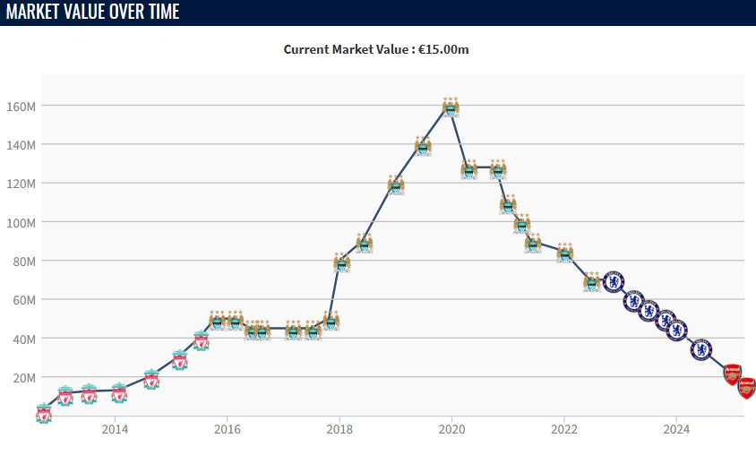 03月18日訊 今日德轉(zhuǎn)更新英超球員身價,阿森納前鋒斯特林身價再跌700萬,目前僅為1500萬歐元,不足巔峰身價十分之一。