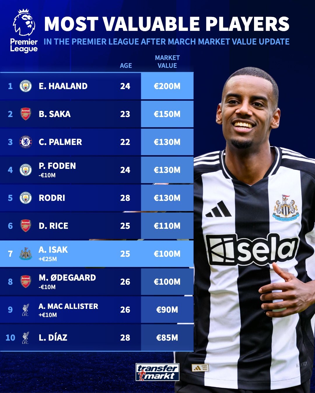03月18日訊 德轉(zhuǎn)更新英超身價,前二哈蘭德、薩卡不變,多位利物浦球員身價增長,一些曼城、阿森納球員的身價小幅下跌,伊薩克、17歲恩瓦內(nèi)里(本月21日將年滿18歲)的身價迎來暴漲。