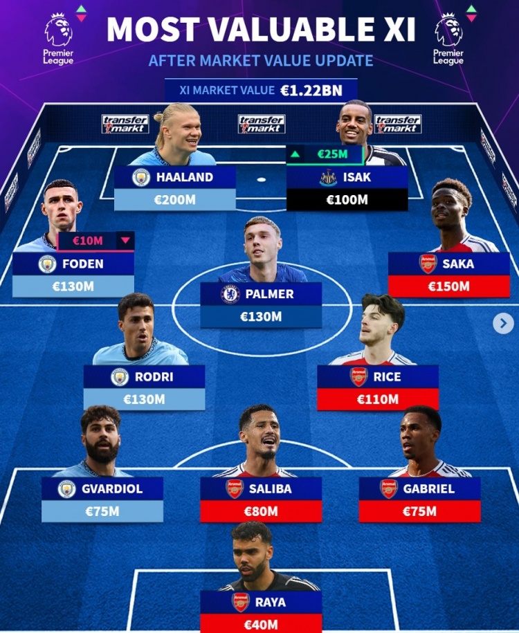 3月19日訊 《轉(zhuǎn)會市場》更新了英超球員身價(jià),并列出了英超最新身價(jià)最貴陣容,曼城和阿森納共計(jì)9席。
