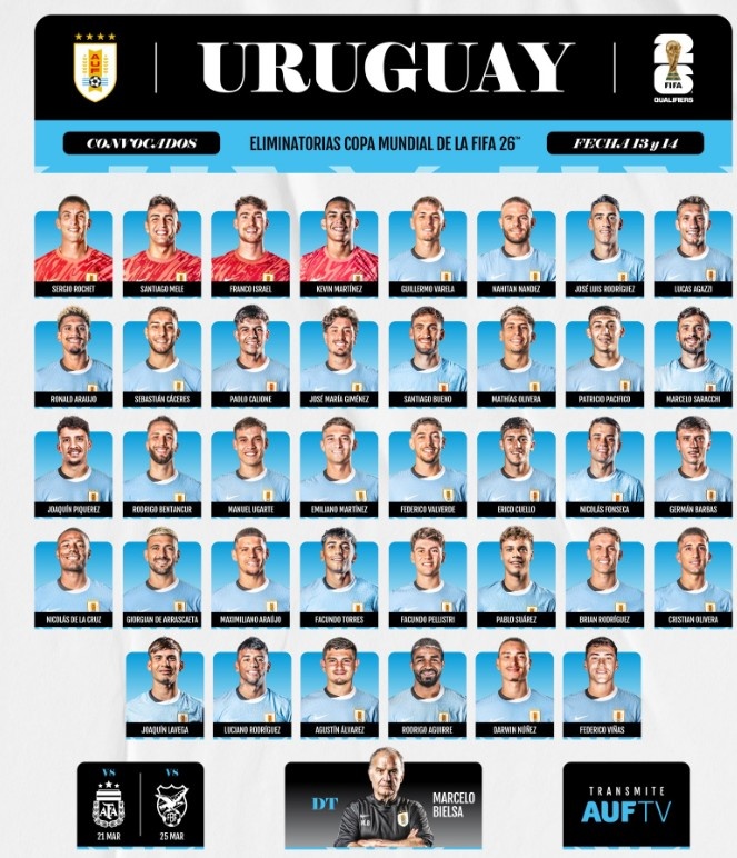 3月19日訊 為了迎接即將到來的對(duì)陣阿根廷和玻利維亞的比賽,烏拉圭國家隊(duì)公布了新一期的大名單,努涅斯、烏加特、本坦庫爾、巴爾韋德入選。