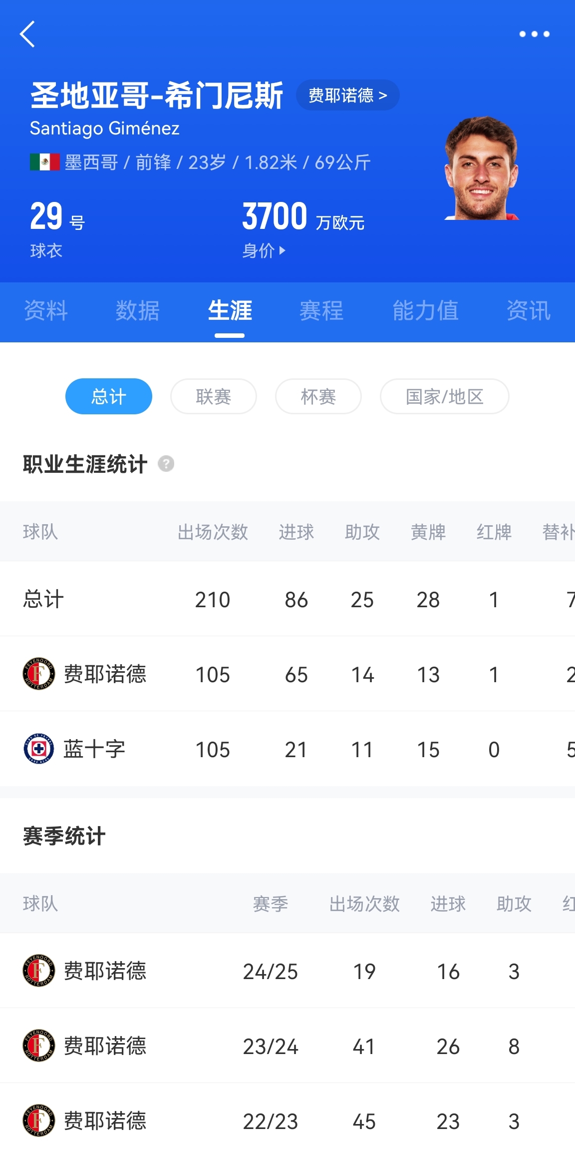 希門尼斯現(xiàn)年23歲,墨西哥前鋒,2022年600萬歐元從墨西哥藍(lán)十字加盟費(fèi)耶諾德,截至目前共為費(fèi)耶諾德出戰(zhàn)105次打入65球,其中本賽季出場(chǎng)19次,打進(jìn)16球并有3次助攻。目前他的德轉(zhuǎn)身價(jià)為3700萬歐元。