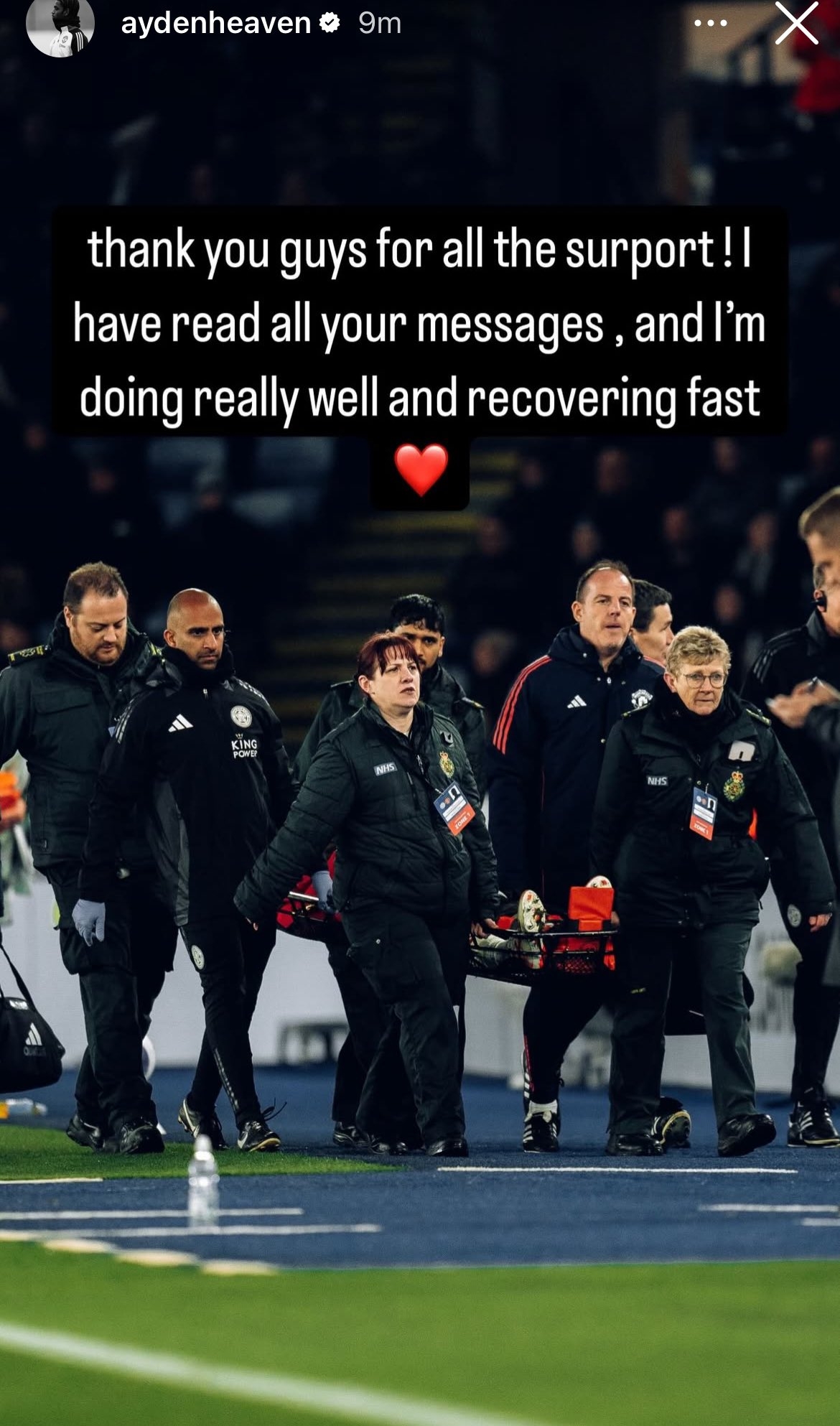 曼聯(lián)在本輪英超3-0客勝萊斯特城,18歲中衛(wèi)海文首發(fā)因傷被擔(dān)架抬離球場(chǎng)。這名小將如今在社媒談到了自己的傷情。