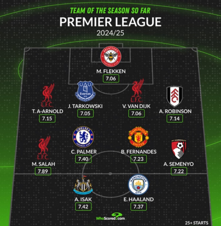 3月19日訊 數(shù)據(jù)網(wǎng)站W(wǎng)hoscored盤點(diǎn)了本賽季英超至今場均評(píng)分最高的11人陣容(至少25次首發(fā)),其中薩拉赫、哈蘭德、B費(fèi)等人在列,具體陣容如下: