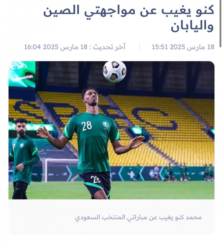 【相關(guān)】沙特媒體:沙特國腳中場穆罕默德-卡努因傷缺席對陣中國、日本