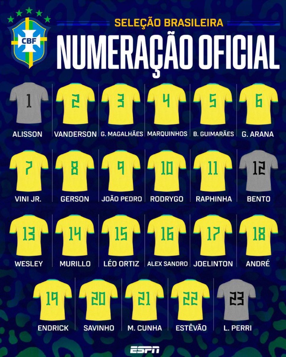 03月20日訊 巴西國家隊(duì)公布新一期球員號(hào)碼,其中維尼修斯7號(hào),羅德里戈10號(hào),若昂-佩德羅9號(hào),恩德里克19號(hào)。