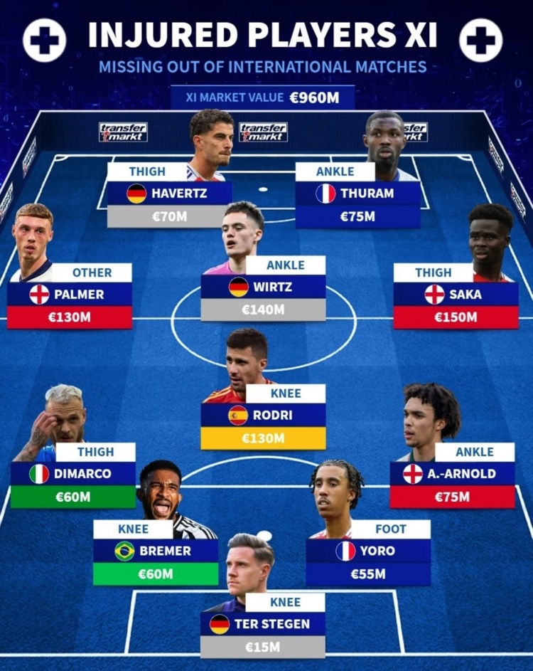 3月20日訊 德國轉(zhuǎn)會(huì)市場列出了因傷缺席國家隊(duì)比賽的球員陣容,薩卡、帕爾默、維爾茨、羅德里、阿諾德在列。