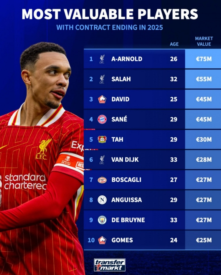 3月20日訊 德轉盤點了目前合同將在今年到期的球員中身價最高榜單,其中阿諾德最高,利物浦三人都在前十,具體如下: