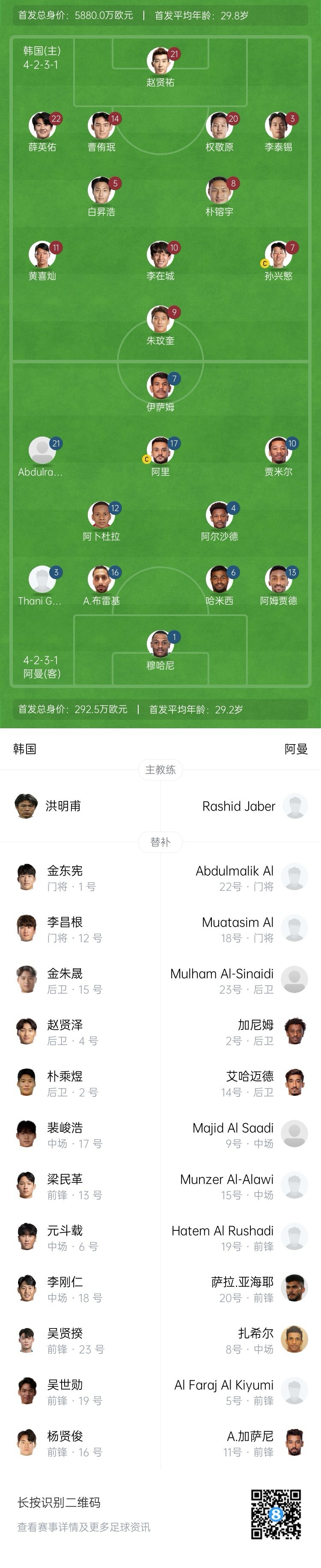 阿曼隊首發(fā):1-穆哈尼、3-拉希迪、16-布雷基、6-哈米西、13-阿姆賈德、12-法瓦茲、4-阿拉伊、21-阿卜杜拉赫曼、17-布賽迪、10-亞哈馬迪、7-薩布希