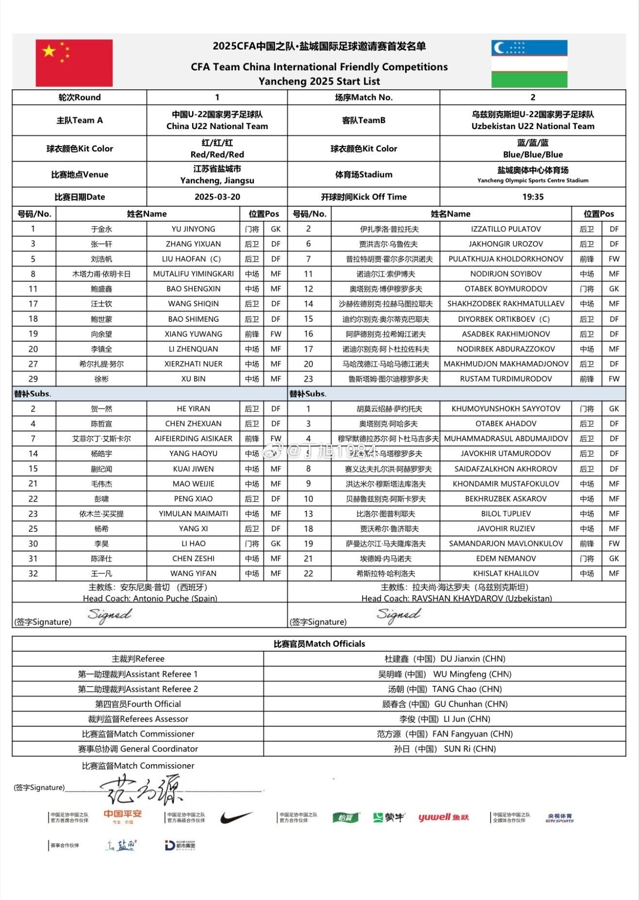 03月20日訊 2025CFA中國之隊·鹽城國際足球邀請賽,中國男足U22vs烏茲別克斯坦U22,賽前雙方首發(fā)公布!此前從國家隊集訓(xùn)回歸的徐彬、汪士欽、劉浩帆先發(fā)出戰(zhàn)。