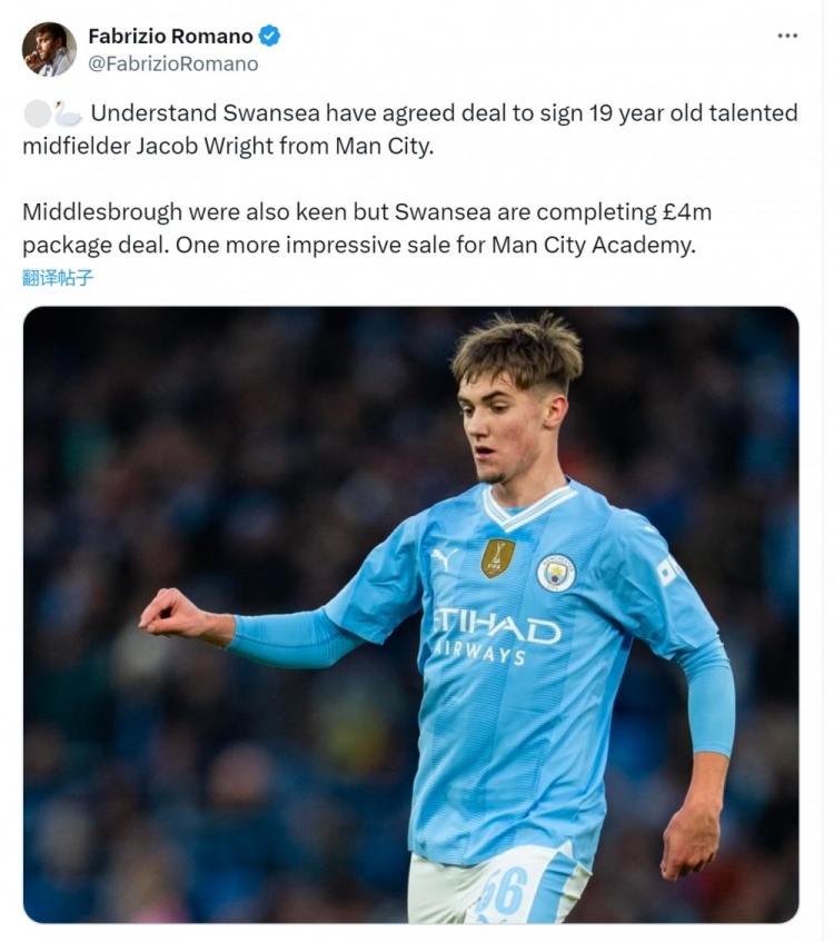 羅馬諾指出,斯旺西和米德爾斯堡都對雅各布-賴特感興趣,最終斯旺西在競爭中勝出,已與曼城就這位小將的轉(zhuǎn)會達(dá)成協(xié)議,轉(zhuǎn)會費400萬英鎊。
