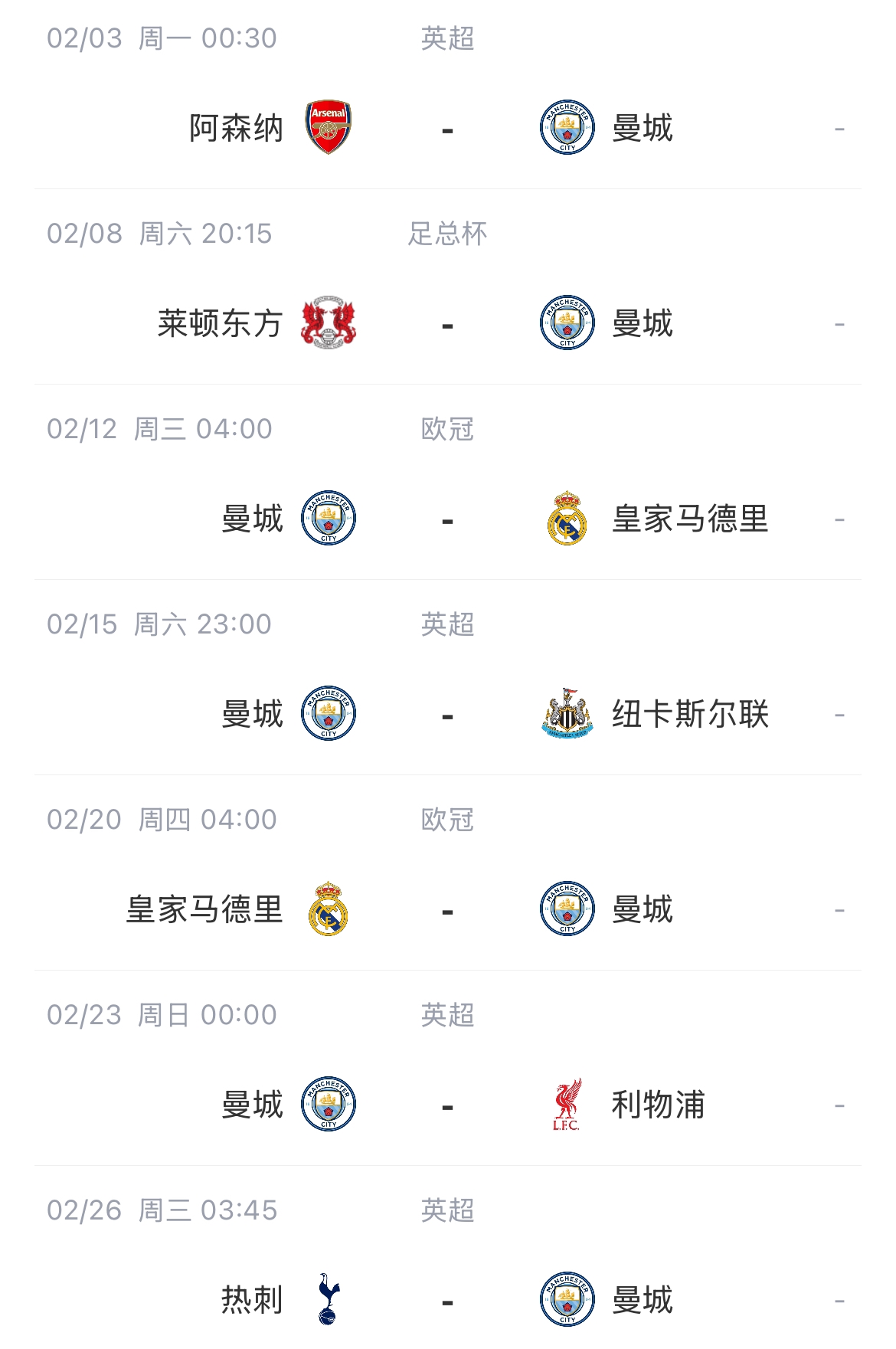 曼城2月首戰(zhàn)將客戰(zhàn)阿森納,對(duì)陣皇馬的兩場(chǎng)歐冠附加賽分別在2月12日和20日進(jìn)行,中間15號(hào)需對(duì)陣紐卡,踢完皇馬的3天之后將對(duì)陣目前的英超榜首利物浦。
