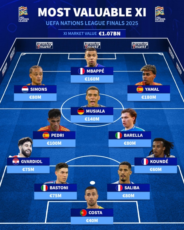 歐國聯(lián)1/4決賽最貴陣容(德轉(zhuǎn)總價10.7億歐)