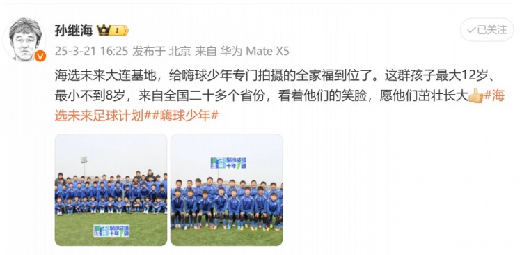 孫繼海寫道:海選未來大連基地,給嗨球少年專門拍攝的全家福到位了。這群孩子最大12歲、最小不到8歲,來自全國(guó)二十多個(gè)省份,看著他們的笑臉,愿他們茁壯長(zhǎng)大。
