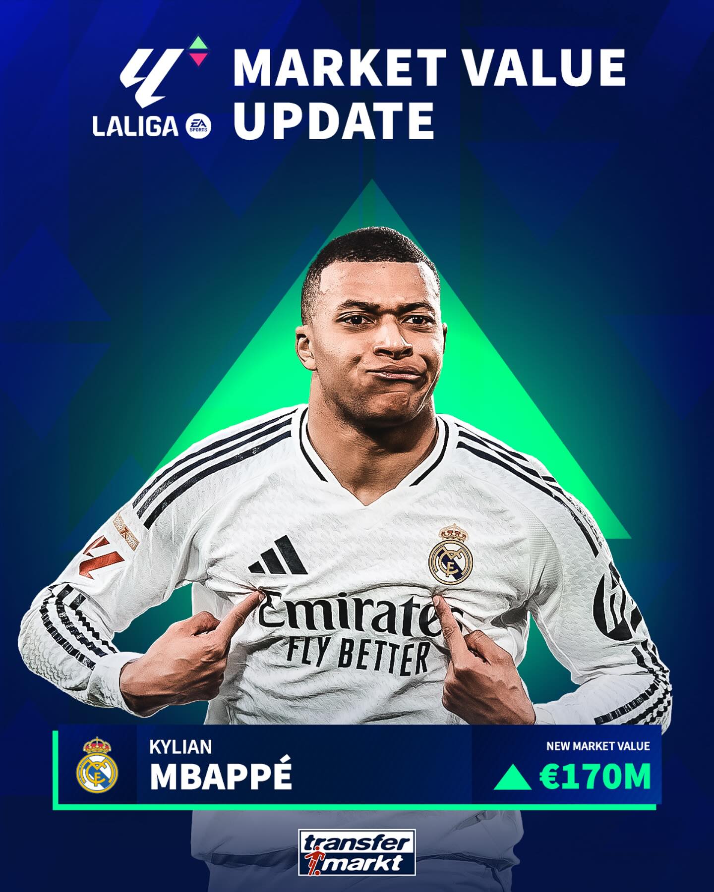 03月21日訊 今日德國轉會市場更新了西甲球員身價,姆巴佩上漲1000萬歐至1.7億歐。