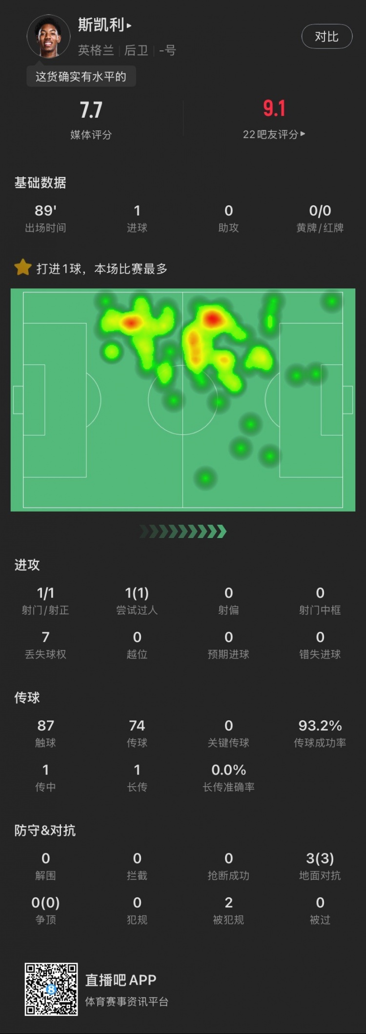 3月22日訊 在剛剛結(jié)束的世預賽歐洲區(qū)小組賽K組首輪比賽中,英格蘭2-0擊敗阿爾巴尼亞。本場比賽,18歲的斯凱利在英格蘭一線隊首秀中破門,并在尾聲階段被換下,獲得了7.7分的高分。斯凱利本場主要數(shù)據(jù)↓射門:1射正:1進球:1過人:嘗試1次,成功1次觸球:87丟失球權(quán):7傳球:74傳球成功率:93.2%傳中:1長傳:1(成功率0%)地面對抗:參與3次,成功3次被犯規(guī):2 本文標簽: 足球 英格蘭