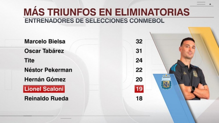 據(jù)ESPN統(tǒng)計(jì),此役是斯卡洛尼帶領(lǐng)阿根廷隊(duì)在南美世預(yù)賽取得的第19場(chǎng)勝利,世預(yù)賽勝場(chǎng)數(shù)排名南美國(guó)家隊(duì)主帥第6位。