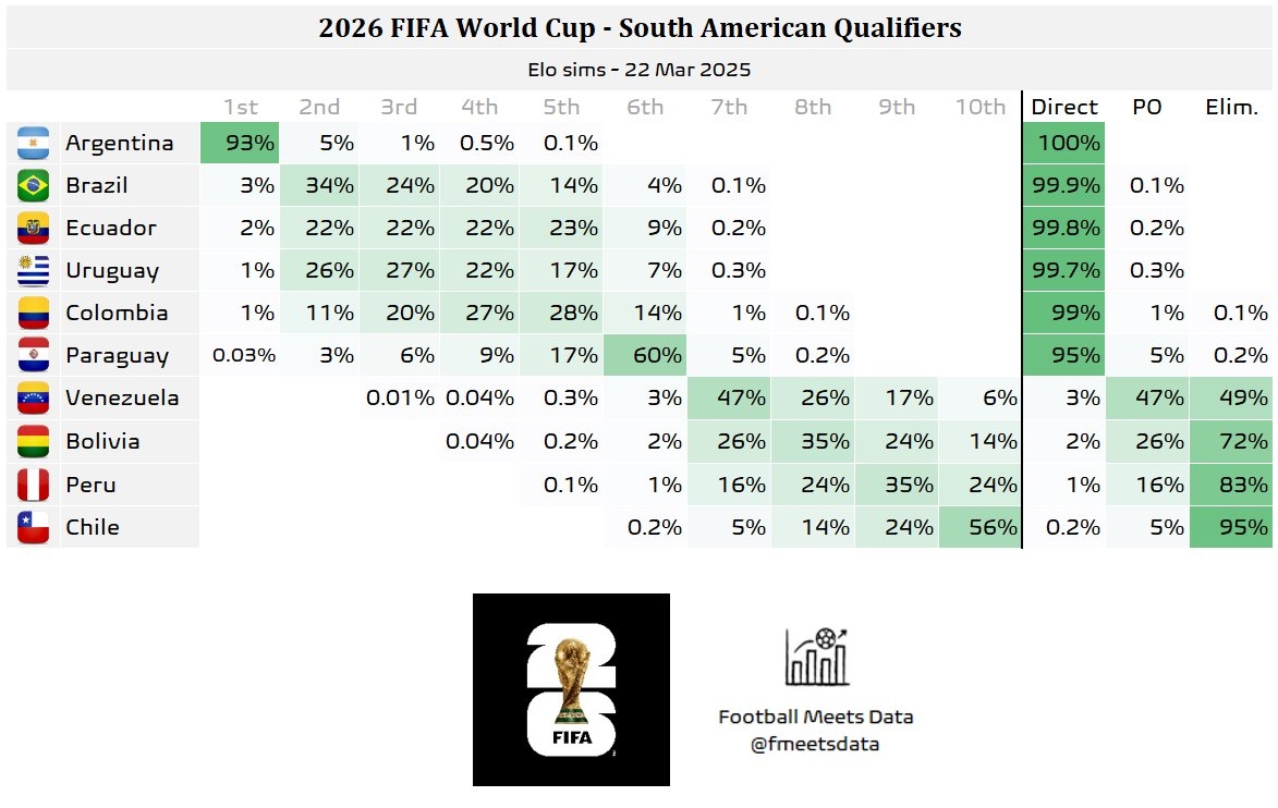 03月22日訊 2026世界杯預選賽南美區(qū)已進行到第13輪,數(shù)據(jù)機構(gòu)Football Meets Data給出了各隊最新的晉級概率。