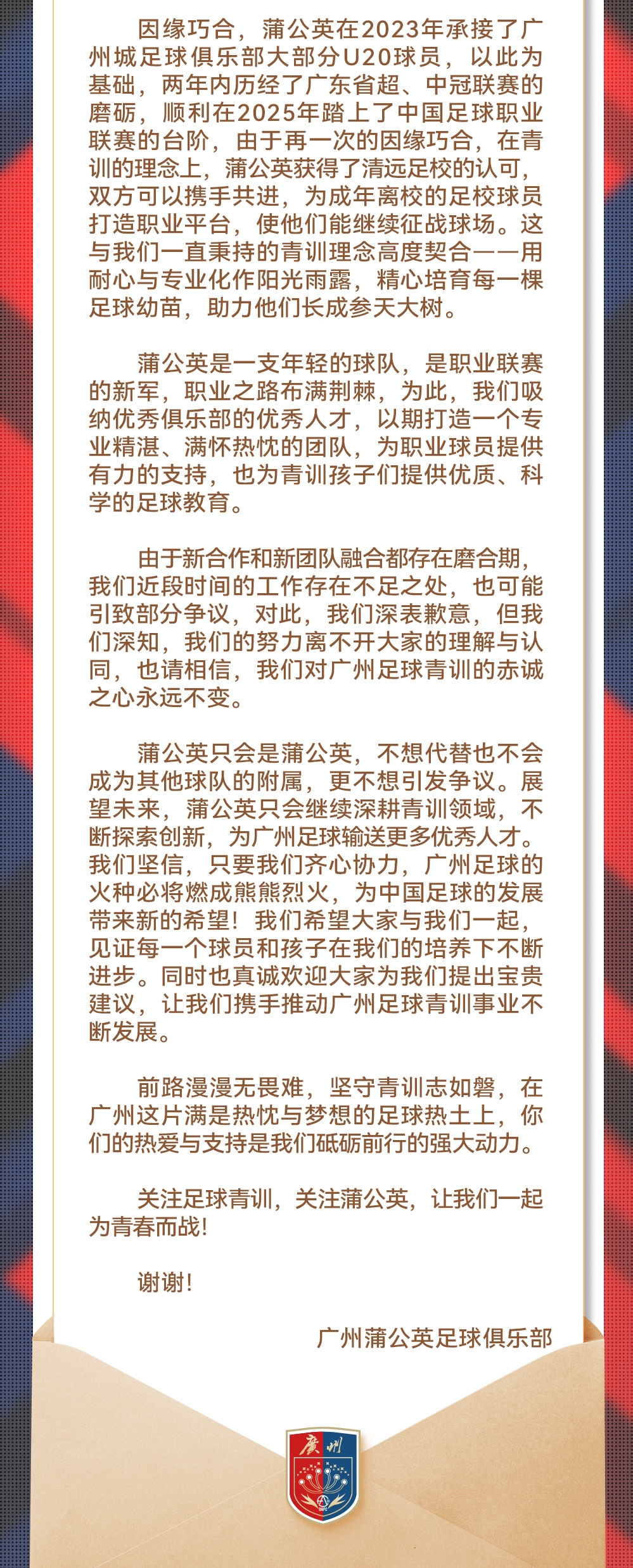 蒲公英只會是蒲公英,不想代替也不會成為其他球隊的附屬,更不想引發(fā)爭議。展望未來,蒲公英只會繼續(xù)深耕青訓(xùn)領(lǐng)域,不斷探索創(chuàng)新,為廣州足球輸送更多優(yōu)秀人才。我們堅信,只要我們齊心協(xié)力,廣州足球的火種必將燃成熊熊烈火,為中國足球的發(fā)展帶來新的希望!我們希望大家與我們一起,見證每一個球員和孩子在我們的培養(yǎng)下不斷進步,同時也真誠歡迎大家為我們提出寶貴建議,讓我們攜手推動廣州足球青訓(xùn)事業(yè)不斷發(fā)展。