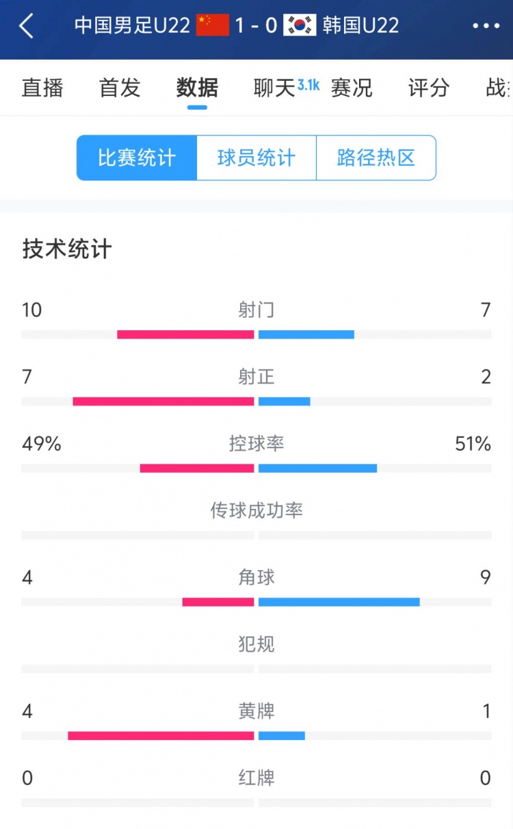 本場(chǎng)數(shù)據(jù)方面,中國(guó)隊(duì)控球率49%,韓國(guó)51%。射門(mén)方面,中國(guó)隊(duì)10次射門(mén)7次射正,韓國(guó)隊(duì)7次射門(mén)2次射正。
