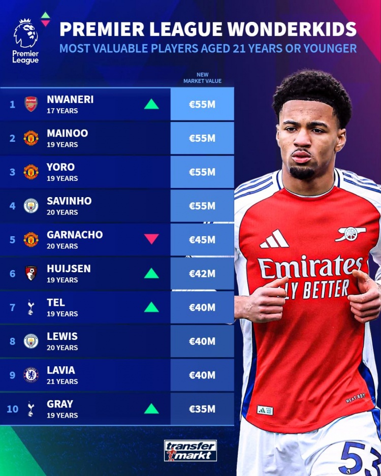 3月19日訊 德國轉會市場更新了英超U21球員的最新身價,并列出身價榜單,恩瓦內里、梅努、約羅、薩維尼奧5500萬歐并列居首。