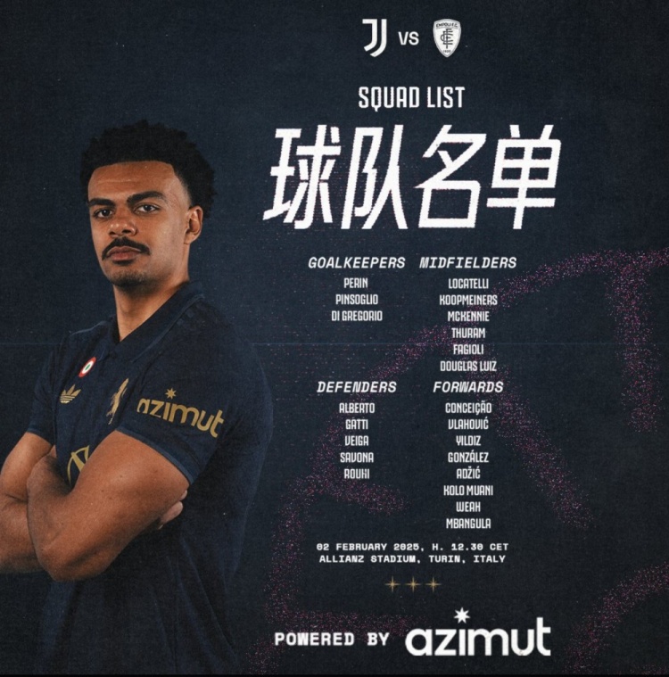 2月2日訊 北京時間今晚19:30,尤文將在主場對陣恩波利。賽前,尤文官方公布了將出戰(zhàn)本場比賽的大名單。由于正值蛇年春節(jié),尤文還特地在名單中用了漢字。
