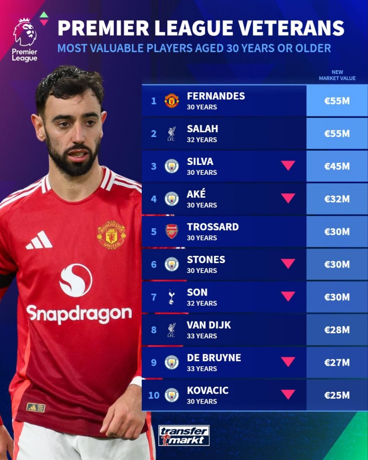 英超年齡30+球員德轉(zhuǎn)身價(jià)排名: