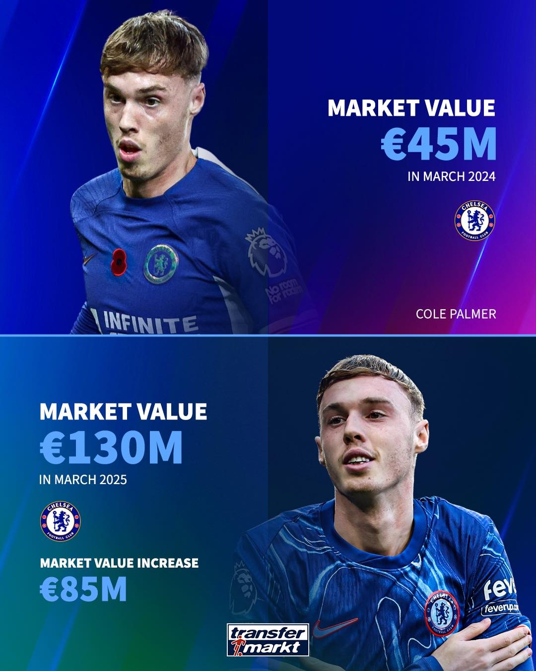 英超球員過(guò)去1年身價(jià)漲幅:帕爾默暴漲8500萬(wàn)歐 馬爾穆什漲6000萬(wàn)