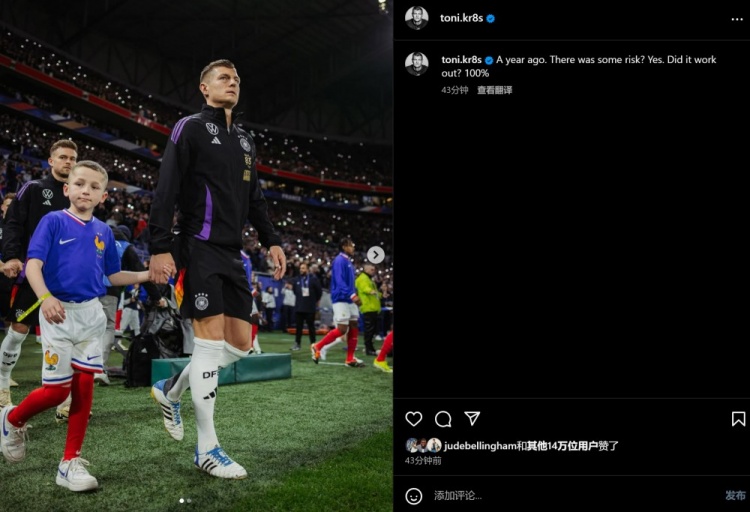 克羅斯曬出比賽照片,并寫道:“一年前。有風(fēng)險(xiǎn)嗎?是的。我成功了嗎?100%?!?/p>