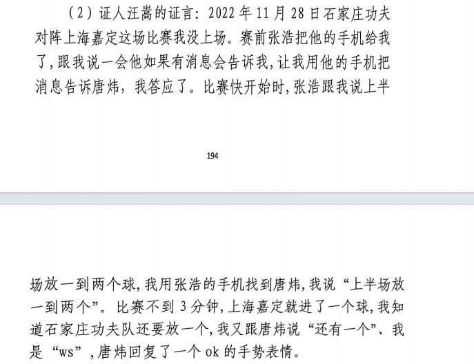 汪嵩證言:2022年11月28日石家莊功夫?qū)﹃嚿虾<味ㄟ@場比賽我沒上場。賽前張浩把他的手機給我了,跟我說一會他如果有消息會告訴我,讓我用他的手機把消息告訴唐煒,我答應(yīng)了。比賽快開始時,張浩跟我說上半場放一到兩個球,我用張浩的手機找到唐煒,我說“上半場放一到兩個”。比賽不到3分鐘,上海嘉定就進了一個球,我知道石家莊功夫隊還要放一個,我又跟唐煒說“還有一個”,我是“ws”,唐煒回復(fù)了一個ok的手勢表情。