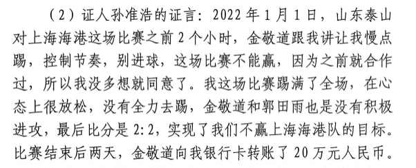 其中孫準浩的證言為:“2022年1月1日,山東泰山對上海海港這場比賽之前2個小時,金敬道跟我講讓我慢點踢,控制節(jié)奏,別進球,這場比賽不能贏,因為之前就合作過,所以我沒多想就同意了。我這場比賽踢滿了全場,在心態(tài)上很放松,沒有全力去踢,金敬道和郭田雨也是沒有積極進攻,最后比分是2:2,實現(xiàn)了我們不贏上海海港隊的目標。 比賽結(jié)束后兩天,金敬道向我銀行卡轉(zhuǎn)賬了20萬元人民幣?!?/p>