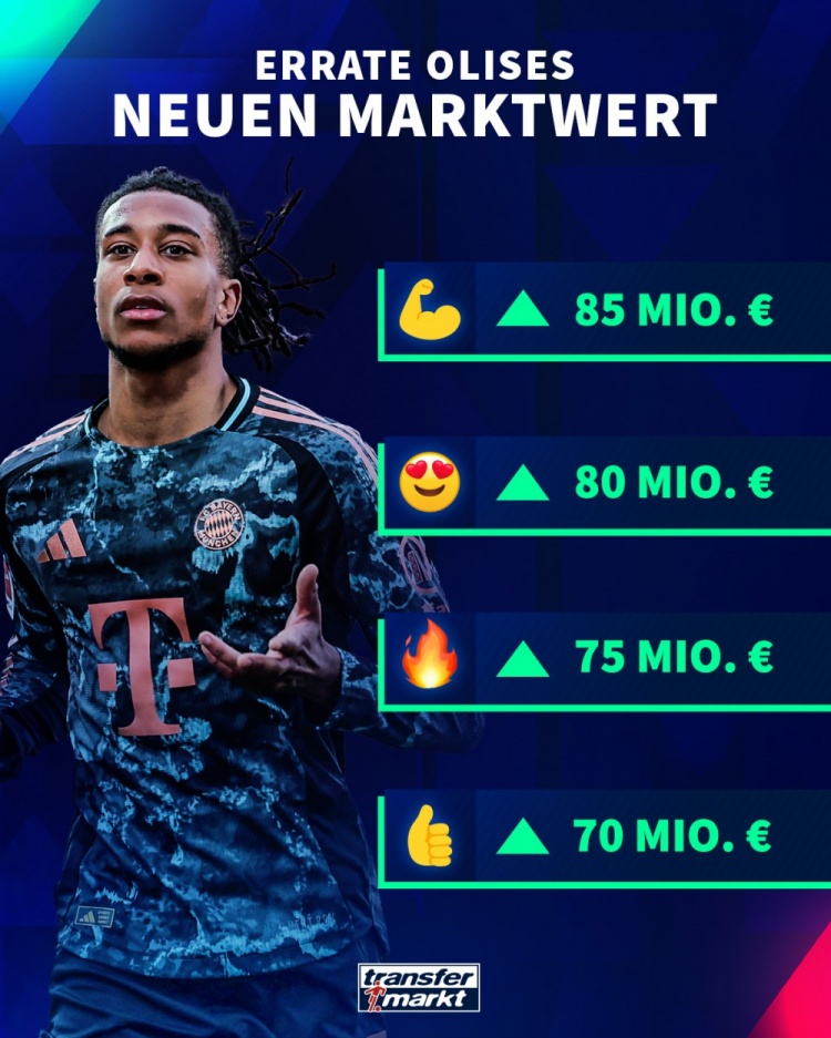 奧利塞目前的德轉(zhuǎn)身價(jià)為6500萬歐元,對于他接下來的最新身價(jià),德轉(zhuǎn)給出了4個(gè)選項(xiàng),由低到高為7000萬歐、7500萬歐、8000萬歐、8500萬歐。