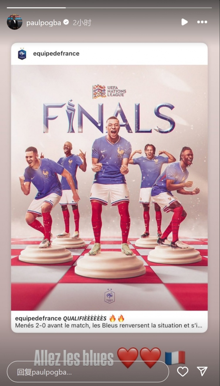 3月24日訊 歐國聯(lián)1/4決賽次回合比賽,法國2-0克羅地亞,兩回合總比分2-2戰(zhàn)平,最終法國在點球大戰(zhàn)中取勝,晉級下一輪。博格巴更新社媒動態(tài),曬出法國隊的海報,祝賀球隊晉級,配文:“加油藍衣軍團!”博格巴職業(yè)生涯至今為法國隊出戰(zhàn)91場比賽,打進11球,助攻9次,幫助球隊贏得2018年世界杯冠軍。博格巴禁賽期結束后尚未找到球隊,目前在邁阿密自主訓練。 本文標簽: 足球 法國