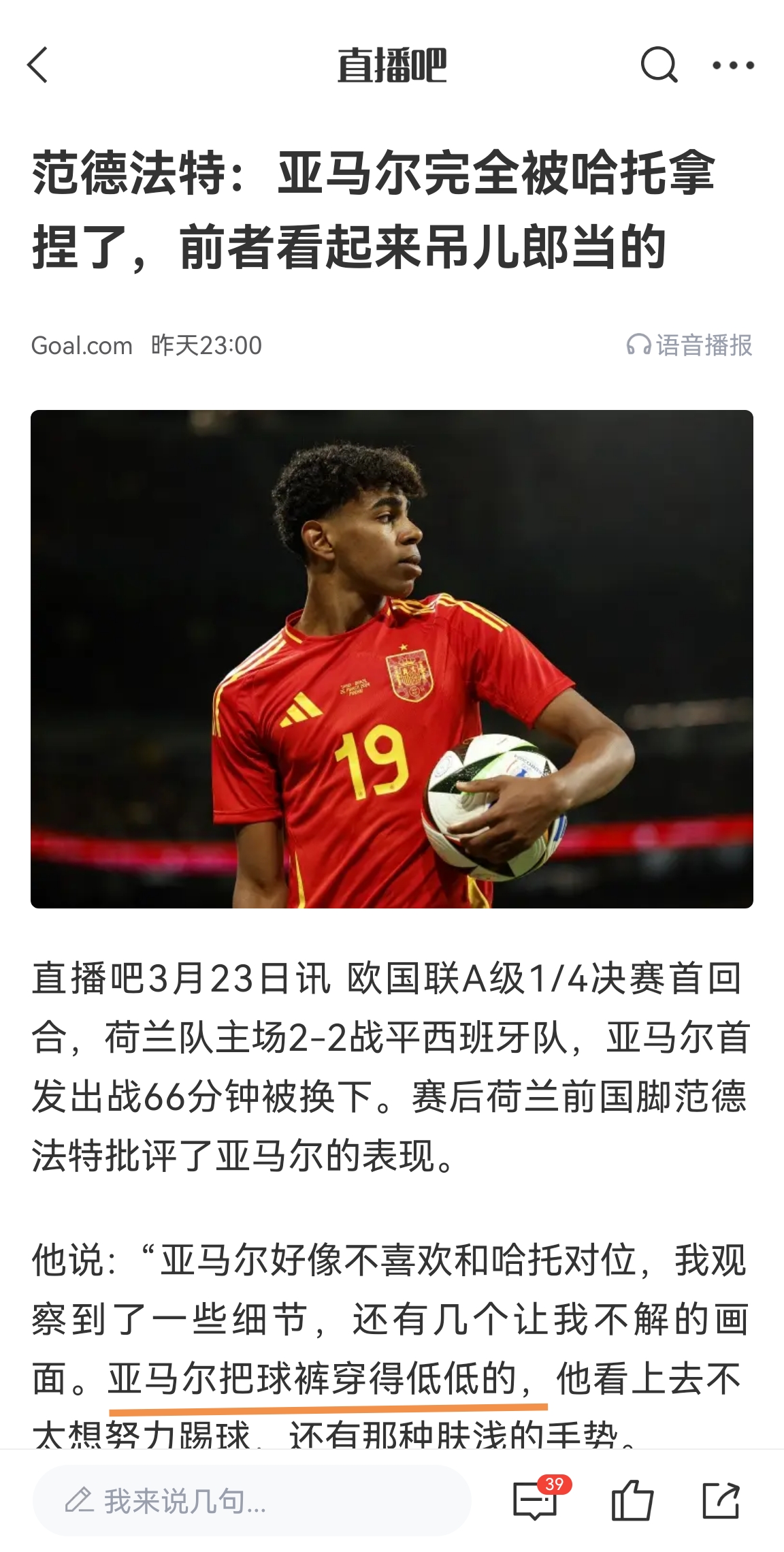 03月24日訊 歐國聯1/4決賽,西班牙點球大戰(zhàn)淘汰荷蘭晉級。加時賽中亞馬爾先入一球,隨后西蒙斯點球扳平。值得一提的是,亞馬爾在進球后選擇了拉低球褲“裝模作樣”的慶祝方式,同樣拉低球褲的尼科甚至把內褲都露了出來。亞馬爾的這一動作顯然是有意為之。就在這場比賽前,荷蘭名宿范德法特批評了亞馬爾在首回合的表現,甚至認為亞馬爾“亞馬爾把球褲穿得低低的,他看上去不太想努力踢球,還有那種膚淺的手勢”。 本文標簽: 足球 西甲 巴塞羅那 西班牙 荷蘭