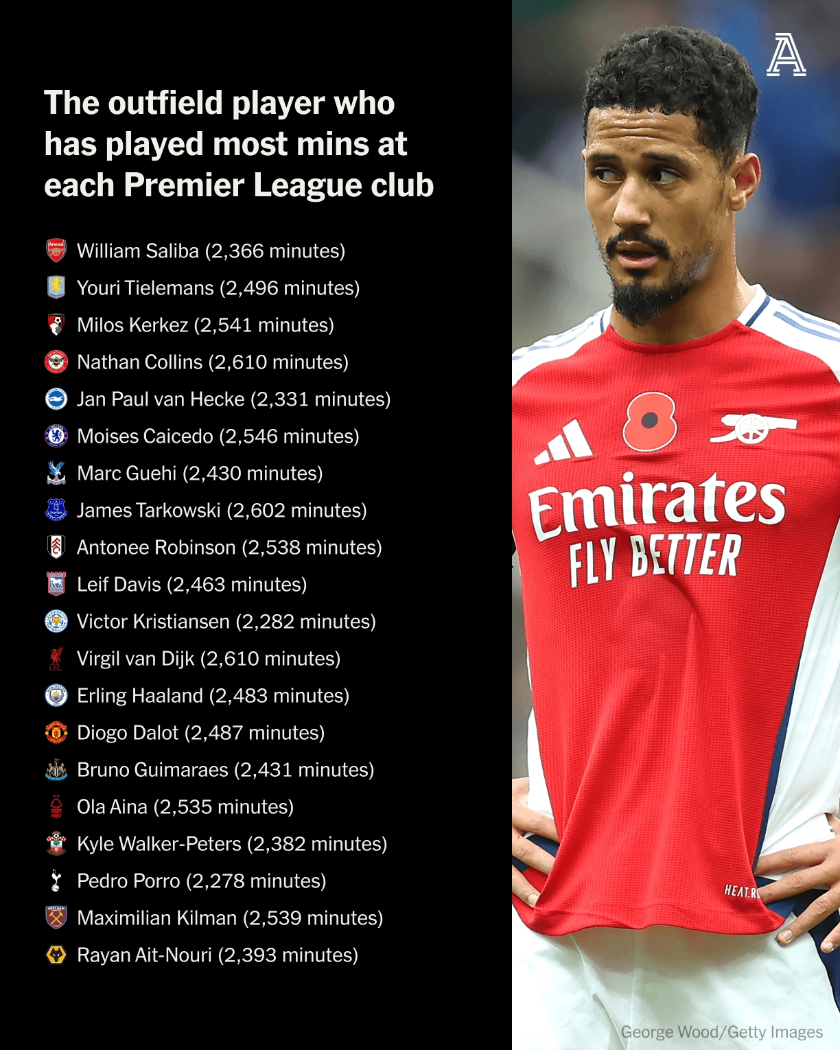 03月24日訊 The Athletic統(tǒng)計(jì)了本賽季英超各隊(duì)出場(chǎng)時(shí)間最多的外場(chǎng)(非門(mén)將)球員,薩利巴、范迪克、哈蘭德、達(dá)洛特、凱塞多在列。