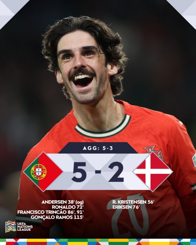 本場比賽丹麥直至常規(guī)時(shí)間第85分鐘仍保持總比分領(lǐng)先,但特林康的進(jìn)球?qū)⒈荣愅先爰訒r(shí),葡萄牙隨后在加時(shí)依靠特林康和拉莫斯再入兩球鎖定勝局。